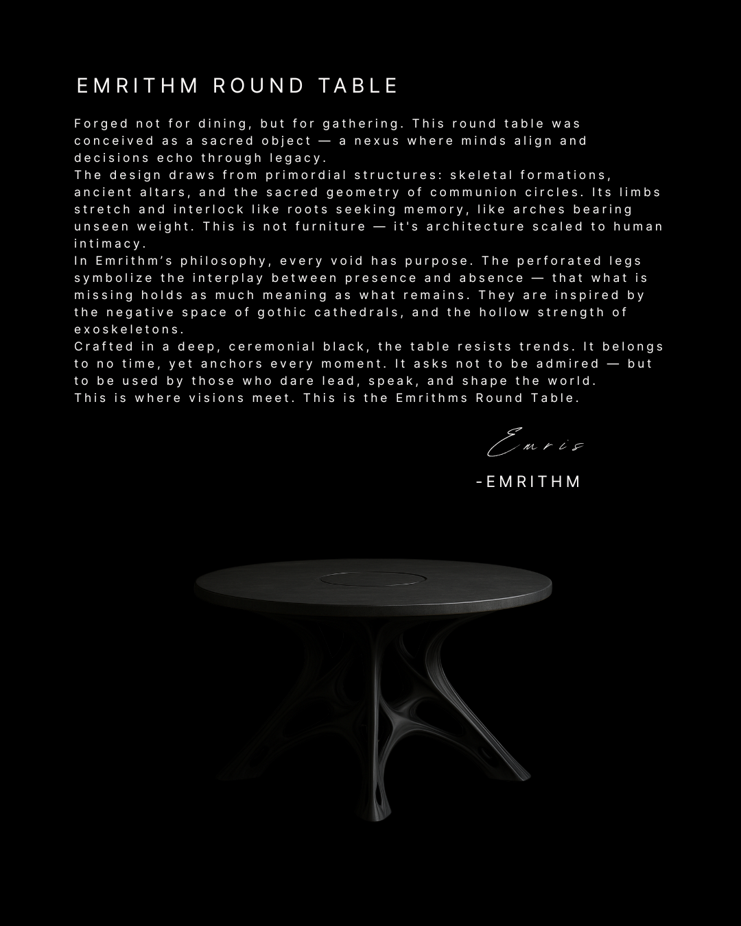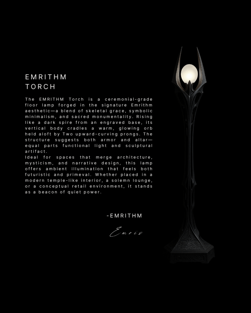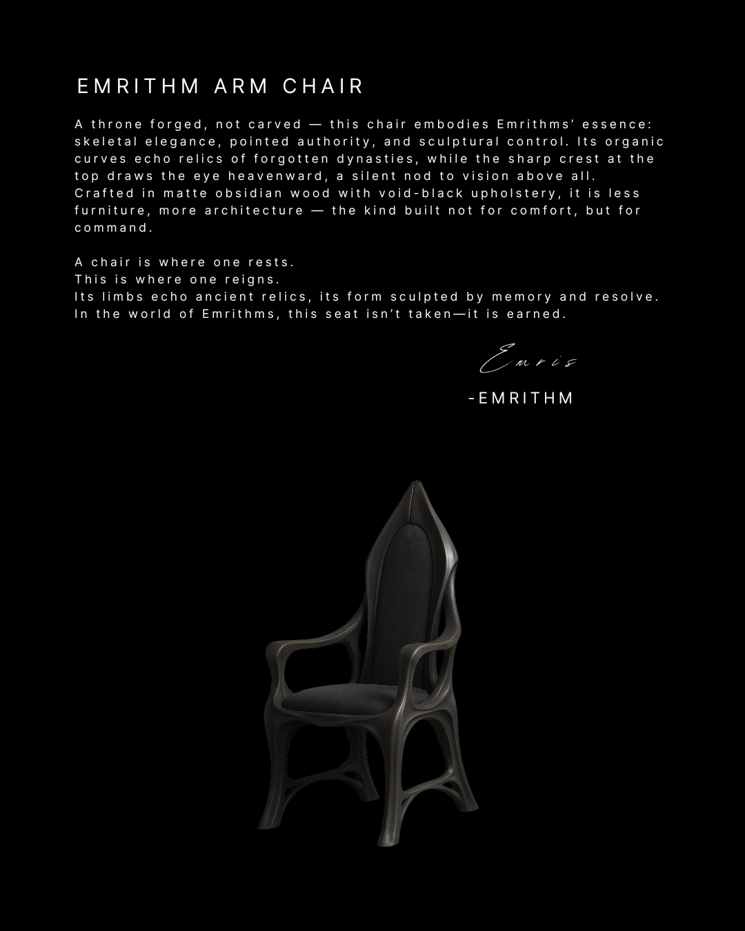 Where others see furniture, objects, or spaces, I see extensions of that inner storm. The skeletal structures, the ceremonial geometry, the monumental presence — all carry the weight of the emotions that created them. Emrithm is proof that what begins as chaos can be transformed into order, beauty, and meaning.